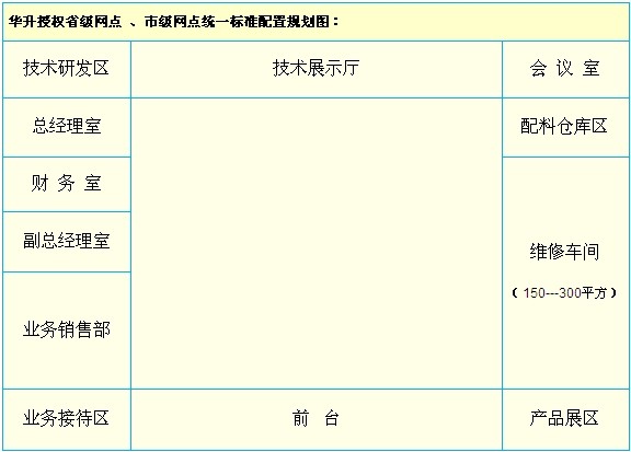 華升總部:負(fù)責(zé)形象策劃、管理、推廣、技術(shù)研發(fā)、技術(shù)支持、方案提供、設(shè)立大型配件倉庫 省級網(wǎng)點(diǎn):省內(nèi)網(wǎng)點(diǎn)管理、工廠級維修、技術(shù)支持、技術(shù)考核、售后管理、配件批發(fā)等 市級網(wǎng)點(diǎn):市內(nèi)網(wǎng)點(diǎn)管理、工廠級維修、技術(shù)支持、技術(shù)考核、售后管理、配件批發(fā)等 特約維修站:區(qū)鎮(zhèn)內(nèi)業(yè)務(wù)承接、維修 保修、檢測配板、配件零售、售后服務(wù)等 |