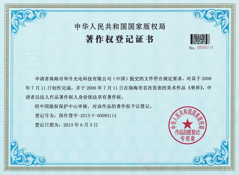 珠海市華升光電科技有公司已經(jīng)成功申請獲得中國版權(quán)局著作權(quán)登記證書。
